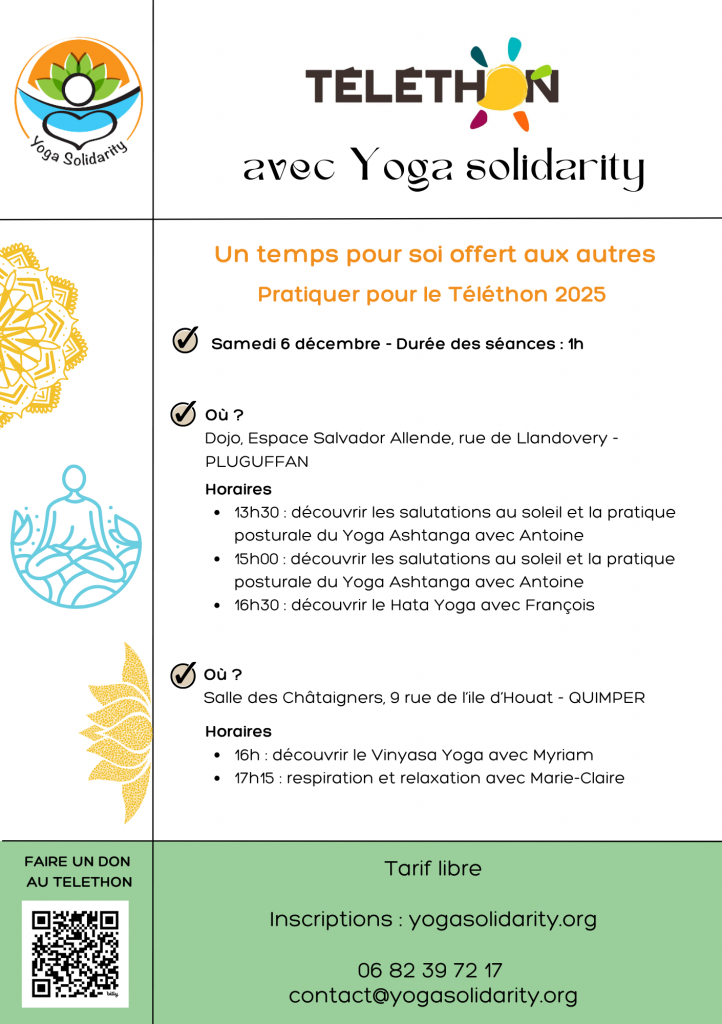 A l’invitation de l’Association Culturelle et Sportive de Pluguffan (ACS 29), Yoga Solidarity a participé aux animations organisées au profit du TELETHON, en animant un atelier de Yoga pour tous, de 2016 à 2018, en 2022, 2024 et 2025.